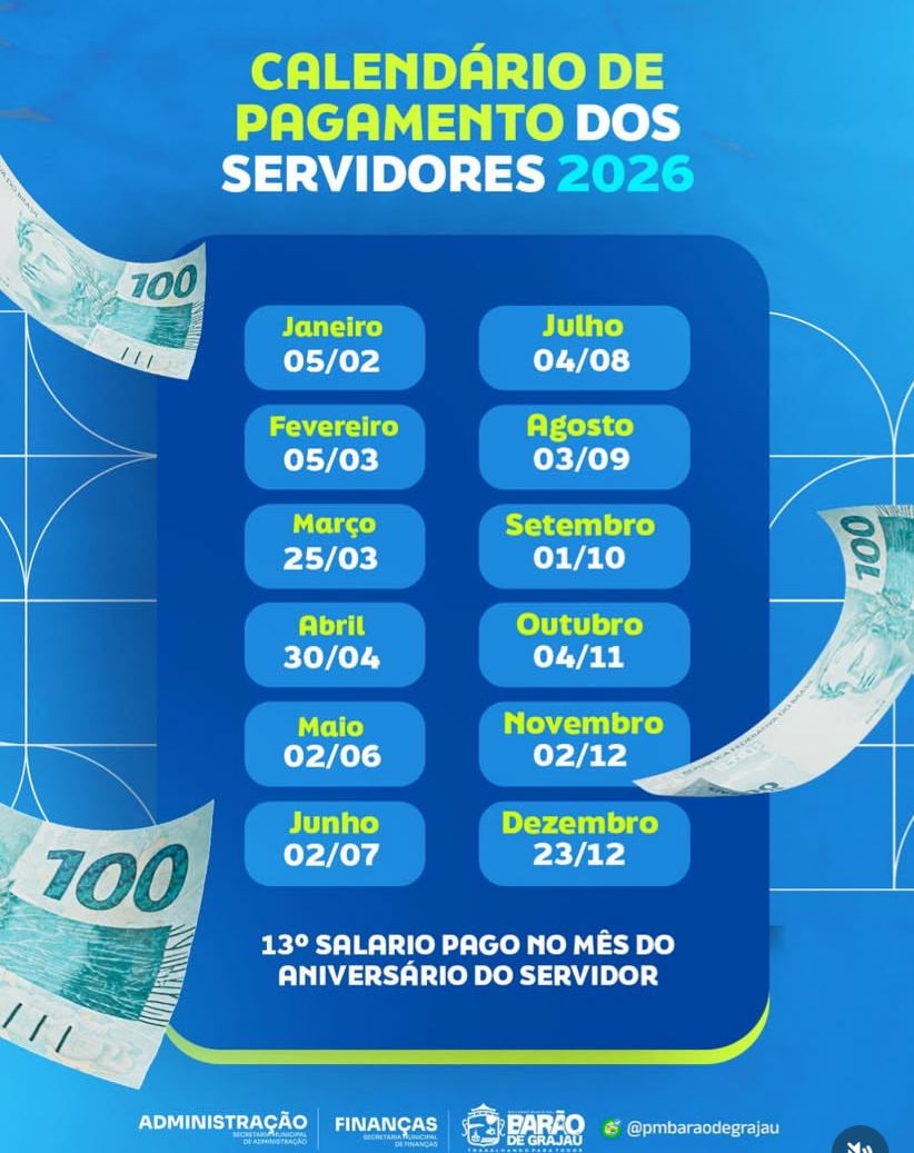 A Prefeitura de Barão de Grajaú, através da Secretaria Municipal de Administração e Finanças, divulgou o calendário oficial de pagamento dos servidores para o ano de 2026. Este calendário é uma importante ferramenta que reforça o compromisso da administração municipal com a valorização e o respeito aos servidores públicos, proporcionando previsibilidade e segurança financeira para os trabalhadores municipais.