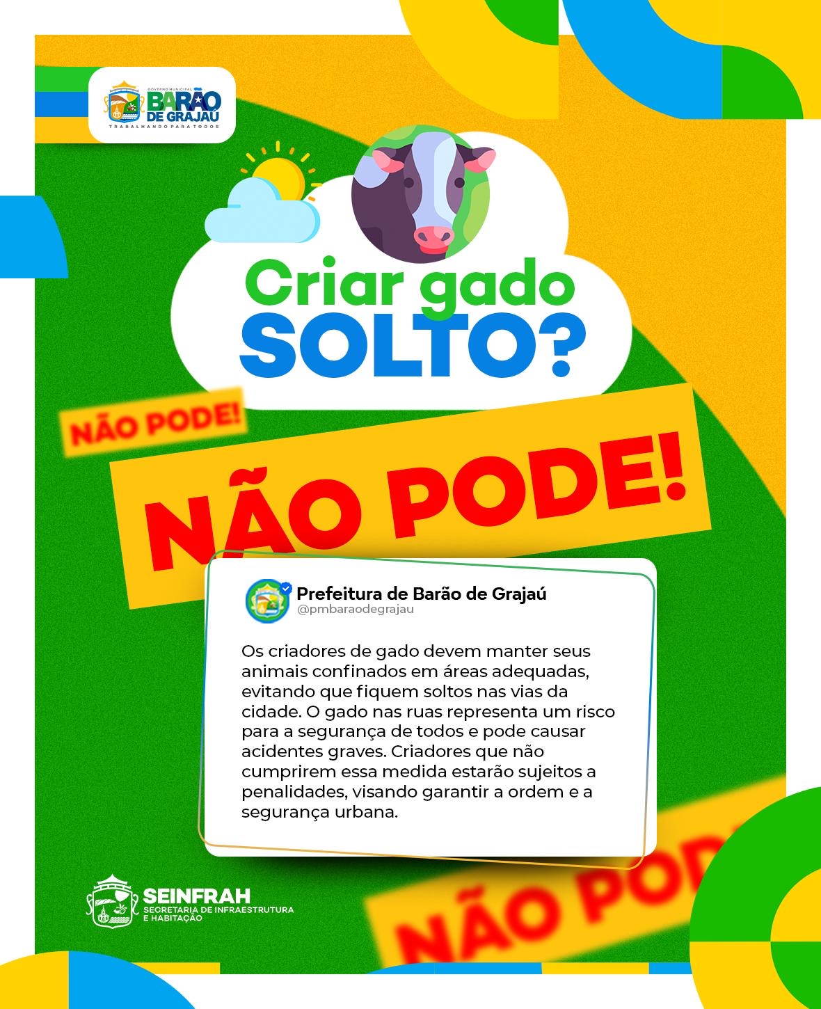A Prefeitura de Barão de Grajaú, por meio da Secretaria de Infraestrutura e Habitação (SEINFRAH), está promovendo uma campanha educativa para conscientizar os criadores de gado sobre a importância de manter os animais em áreas apropriadas, evitando sua circulação nas vias públicas. A iniciativa visa garantir a segurança dos moradores, prevenir acidentes e promover a ordem urbana.