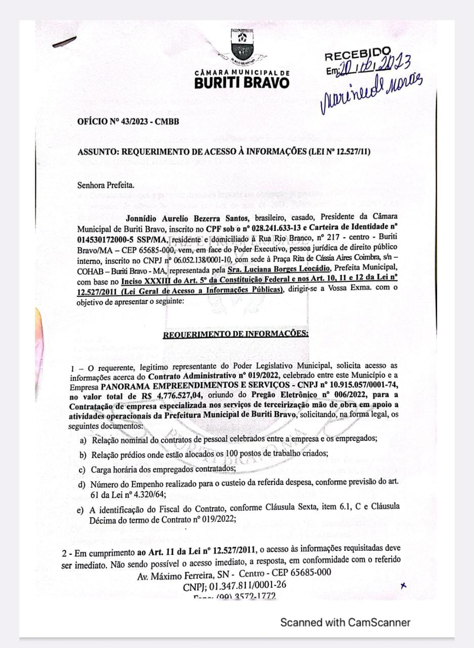 O Presidente Jonnidio Bezerra, é legítimo representante do Poder Legislativo Municipal, e solicitou acesso às informações acerca do Contrato Administrativo n° 019/2022, celebrado entre o Município e a Empresa PANORAMA EMPREENDIMENTOS E SERVIÇOS – CNPJ n° 10.915.057/0001-74, no valor total de RS 4.776.527,04, oriundo do Pregão Eletrônico n° 006/2022, para a Contratação de empresa especializada nos serviços de terceirização mão de obra em apoio a atividades operacionais da Prefeitura Municipal de Buriti Bravo, solicitou, na forma legal, as seguintes informações